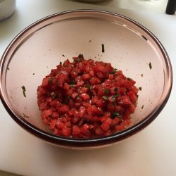 2In a mixing bowl, combine the tomatoes, basil, garlic, oregano, red pepper, salt, pepper and olive oil. Use more olive oil, if necessary, to coat the entire mixture. Allow the mixture to sit for 10 minutes.