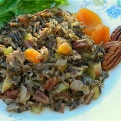 "The nutty flavor of wild rice makes a great combo with dried apricots, pine nuts, and traditional ingredients. I combined some recipes and the result was eagerly consumed. When I made this I fully cooked the rice. This is a forgiving and flexible recipe. There are so many different things to add or substitute: walnuts, almonds, orange zest, dried cranberries, mushrooms, more bread, whatever you prefer."
