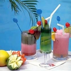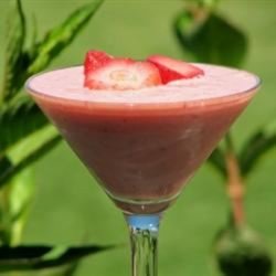 "This summertime drink with pink lemonade, gin, ice cream, and strawberries is sure to help cool you down. Try it garnished with a dollop of whipped topping and a fanned strawberry."