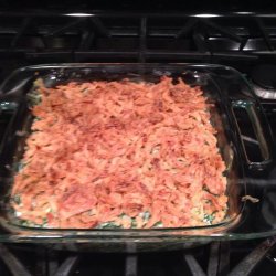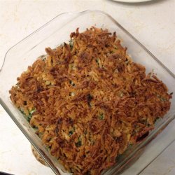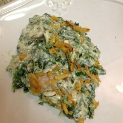 2In a large bowl combine spinach, cream cheese, mushroom soup and 1/2 of the fried onions; mix well. Transfer mixture to a 2 quart casserole dish and sprinkle with remaining fried onions.
