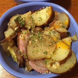1Preheat the oven to 400 degrees F (200 degrees C). Place the potatoes in the preheated oven, and bake for 45 minutes, or until tender. Turn once or twice. Cool, peel and cut into 1/4 inch slices.