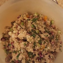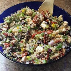 2Gently stir the chicken, onion, bell pepper, olives, feta cheese, parsley, chives, and salt into the quinoa. Drizzle with the lemon juice, balsamic vinegar, and olive oil. Stir until evenly mixed. Serve warm or refrigerate and serve cold.