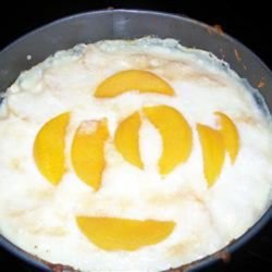 3Cream together softened cream cheese, sugar, and 3 tablespoons reserved peach syrup. Spoon mixture carefully on top of peaches, just to edges. Sprinkle sugar and cinnamon on top.