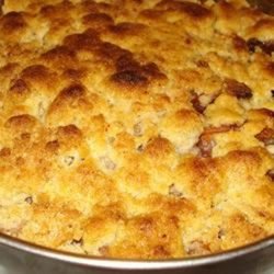 4In a medium bowl, combine 3/4 cup flour and 1/3 cup brown sugar. Cut in the butter until the mixture resembles small peas. Stir in the chopped pecans and sprinkle the crumble on top of the fruit.
