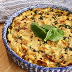 2Cook and stir bacon in a large skillet over medium heat until some of the fat is released, about 2 minutes. Add onion; cook and stir until onion turns golden and bacon is crispy, 3 to 5 minutes. Stir in spinach and cook until wilted, about 2 minutes.