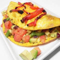 Preheat a nonstick skillet over medium heat. Pour in eggs. Scatter feta cheese, avocado, tomatoes, olives, and basil over 1 side. Cook until bottom is golden brown, about 5 minutes. Fold over; cook until center is set, about 3 minutes more.