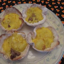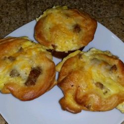4Whisk eggs, milk, salt, and pepper together in a bowl until well-beaten. Pour egg mixture into each dough cup, filling each just below the top of the biscuit dough. Sprinkle Cheddar cheese on top of egg mixture.