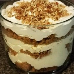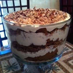 5Layer 1/3 of the cake cubes into the bottom of a large bowl; top with 1/3 of the cream mixture and sprinkle with 1/3 of the pecans and toffee bit. Repeat layering until all ingredients are uses. Refrigerate 1 hour before serving.