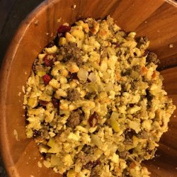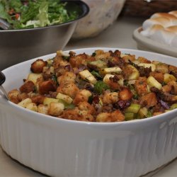 2Into the same pan melt the butter. Add the leeks or onions, apples, celery and poultry seasoning; cook until softened, about 10 minutes. Add the rosemary, dried cranberries and cooked sausage. Mix all with the dried bread cubes. Season to taste with salt and pepper. Moisten with the chicken stock.