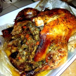 3Stuff turkey with about 5 cups for a 14 pound turkey. Add additional chicken stock to moisten stuffing if needed. Remaining stuffing can be baked in a covered buttered casserole at 350 degrees F (175 degrees C) for about 45 minutes. Uncover and bake for another 15 minutes to brown top.