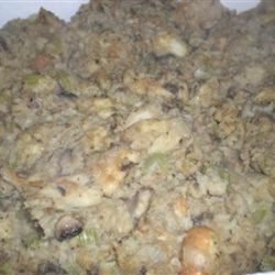 "This is a very basic and simple stuffing recipe that my Grandma Ruth was famous for. You can easily replace the eggs with an egg substitute with no noticeable taste difference. My family does not, but you can easily add cooked bulk sausage to this stuffing. For a moist stuffing made outside of the bird, add additional chicken stock and cover with foil while baking. Remove foil for the last 20 minutes to crisp up the top."