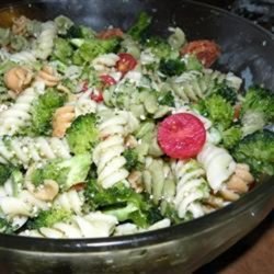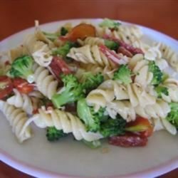 3Add broccoli, pepperoni, and tomatoes; toss well. Sprinkle with mozzarella cheese, and serve.