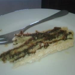 5Return the prune puree to the saucepan and add the white sugar, cinnamon, lemon juice and 4 tablespoons reserved prune liquid. Bring the mixture to a boil, then remove from heat. Assemble the torte layers, spreading them with warm prune filling. Let stand for 24 hours before slicing.
