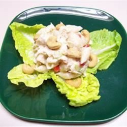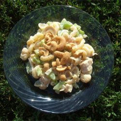 "This is a great summer pasta salad for barbeques and more. It has a slightly sweet, creamy dressing, and is loaded with chicken, cashews, and crunchy veggies."