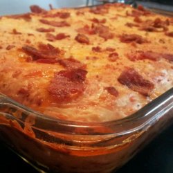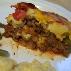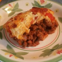 3In a large saucepan over medium-high heat, saute the beef, onion and bell pepper until beef is browned. Drain, and stir in the 6 slices crumbled bacon and pizza sauce. Spoon mixture into an ungreased 9x13 inch pan. Sprinkle with tomatoes and top with the cheese.