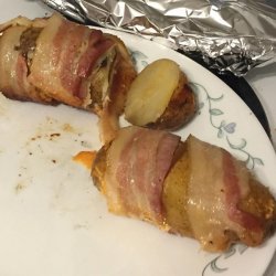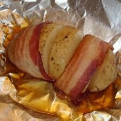 3Grill potatoes until the bacon has crisped, and the potato is soft in the center, about 45 minutes depending on grill temperature.