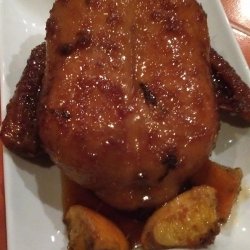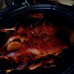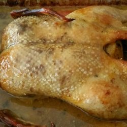 3In a small saucepan combine the honey, butter, lemon juice and orange juice concentrate. Simmer together over low heat until syrupy; pour a little of the mixture over the duck, saving the rest for basting. Cover roaster.