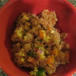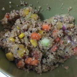 2Stir the tomato, carrots, bell pepper, cucumber, corn, and 1/4 cup red onion into the chilled quinoa. Season with cilantro, mint, 1 teaspoon salt, and 1/4 teaspoon black pepper. Drizzle the olive oil and balsamic vinegar over the salad; gently stir until evenly mixed.