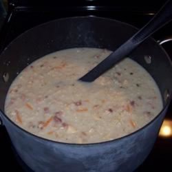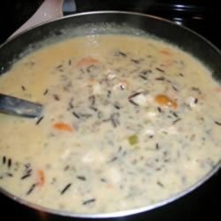 4In a large pot, combine cream of chicken soup, milk, chicken mixture, carrots, almonds, 5 tablespoons butter and parsley. Bring to a boil, stirring, then reduce heat to low and stir in rice. Simmer, uncovered, 15 minutes, stirring occasionally and adding more water or milk to thin if needed. Serve at once.