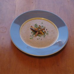 4Puree soup in a food processor or blender, and return to saucepan. Stir in cream, and heat (DO NOT BOIL). Season with salt and pepper to taste. Garnish with creme fraiche, shiitake mushrooms, and chives.