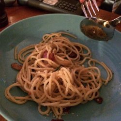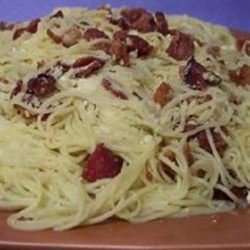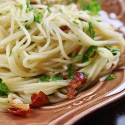 Process garlic cloves through a garlic press, and combine with olive oil. Toss spaghetti, bacon, garlic/olive oil. Season with salt and pepper to taste. Sprinkle with Parmesan cheese.