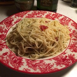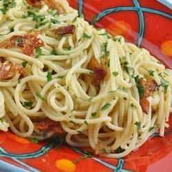 2Meanwhile, heat the olive oil in a large skillet over medium heat. Stir in the bacon, and cook until the bacon has begun to shrink, about 3 minutes. Add the garlic, and continue cooking and stirring until the garlic has softened, and the bacon is crisp, about 5 minutes. Toss the drained pasta with the bacon, oil, and parsley to serve.
