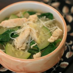 1Bring the chicken broth, garlic, and ginger to a boil in a large saucepan; reduce heat to medium and cook for 10 minutes. Add the zucchini and cook until the zucchini is tender, about 10 minutes more.
