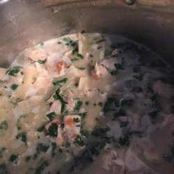 "Creamy soup with mild spice and a zip of citrus. It is inspired by Tom Kha Gai from Laotian and Thai cuisines, but it comes together quickly from ingredients that are easily and routinely available--real Tom Kha needs fresh lemon grass, kaffir lime leaves, and galangal root, which are not always available in my locale."