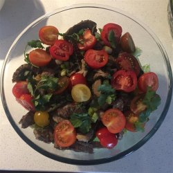 3Tear the lettuce into bite size pieces and place in a salad bowl. Arrange the cucumber on top of the lettuce, and then pour the meat and sauce over. Top with the cherry tomatoes and garnish with fresh cilantro leaves.