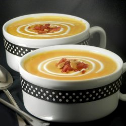 "I tried out for the show 'Master Chef' this past October in New York City. One of my fellow contestants made a pumpkin soup with applewood bacon. He made it to the next round, but sadly I did not. This is my rendition of his soup. I made it my own by using butternut squash and sweet potato and made it richer by turning this into a bisque. I hope you enjoy it as much as I did. Please share your comments. For less-fat option substitute half-and-half with milk or nonfat half-and-half."