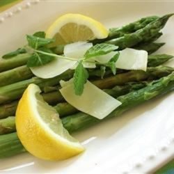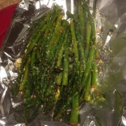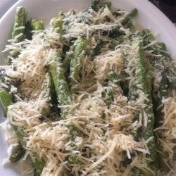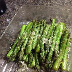 1Melt butter with olive oil in a large skillet over medium heat. Add asparagus spears, and cook, stirring occasionally for about 10 minutes, or to desired firmness. Drain off excess oil, and sprinkle with Parmesan cheese, salt and pepper.