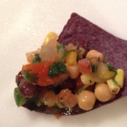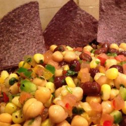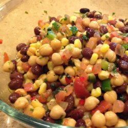 1Mix black beans, garbanzo beans, corn, tomatoes, bell pepper, salsa, cilantro, lime juice, jalapeno pepper, salt, garlic powder, black pepper, cumin, and onion powder together in a bowl.