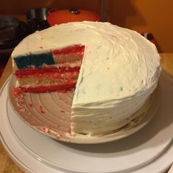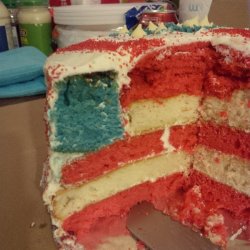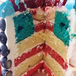 15To serve, cut cake into wedges. The inside of the cake will reveal its layers of red and white stripes and blue field with white chocolate chip stars in every slice.