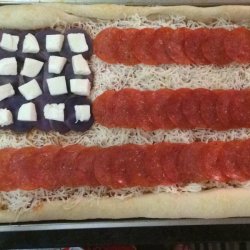 6Spread Alfredo sauce over the baked crust; top with Italian cheese blend. Arrange potato rounds in the top left corner of the pizza, forming the blue portion of the flag. Brush potatoes with remaining olive oil. Place mozzarella ball halves on top of the potatoes to resemble the stars of the flag. Arrange pepperoni slices, slightly overlapping, in rows across the pizza to resemble the stripes on the flag.