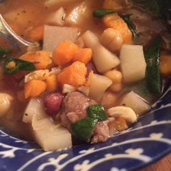 2In a large pot, place drained beans, chorizo, soup bones and 1 quart water (or more as needed to cover). Cook over medium heat until beans are just beginning to be tender, 1 hour.