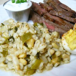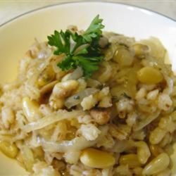 2Melt butter in a skillet over medium-high heat. Stir in onion, barley, and pine nuts. Cook and stir until barley is lightly browned. Mix in green onions, mushrooms, and parsley. Season with salt and pepper. Transfer the mixture to a 2 quart casserole dish, and stir in the vegetable broth.