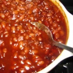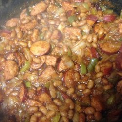 2In a Dutch oven, combine the baked beans, onion, bell pepper, and sausage. Season with chili powder, Worcestershire sauce, vinegar, brown sugar, ketchup, garlic powder and salt. Add a dash of cayenne if desired.