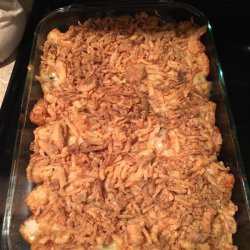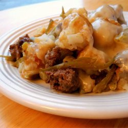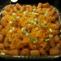 2In a large skillet cook ground beef with onion, salt and pepper; drain and spread into the bottom of a 9x13 inch baking dish. Add tater tots; mix cream of mushroom and cream of celery soup together and pour mixture over dish. Top with onion rings, if using.