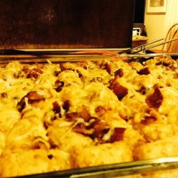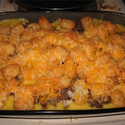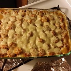 Spread soup and beans in the bottom of a 9x13 inch baking dish. Slowly add meat mixture, then top with tater tots and season with salt to taste.