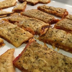 3Brush the second pie crust with olive oil and sprinkle oregano over the oil. Lay crust, oil-side up, on top of the pepperoni layer. Cut pizza into 1x3-inch strips. Place strips on a baking sheet.