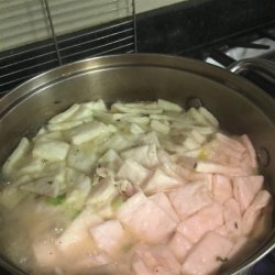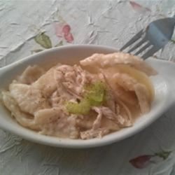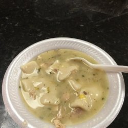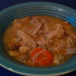 2Roll out to about 1/8 inch thickness and cut into 1 inch squares, 1 to 1 1/2 inch strips or diamonds. Sprinkle lightly with flour and drop into boiling chicken stock. Cover tightly and boil gently for 8 to 10 minutes.
