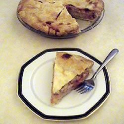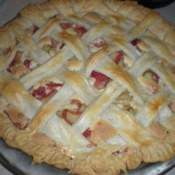 2In a large bowl, mix together sugar, flour, and nutmeg. Stir in eggs. Fold in rhubarb making sure to coat well, then do the same with the strawberries. Pour mixture into pie crust. Place second crust on top being sure to cut slits into it to vent steam. Brush egg white on top crust.