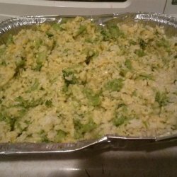 3While the rice is cooking, place frozen broccoli in large skillet. Heat stove to low-medium and defrost broccoli When the broccoli is 90% defrosted add processed cheese sauce to the broccoli and let melt. When rice has completed cooking add broccoli-cheese mixture and rice to 9x13 baking dish and mix well.