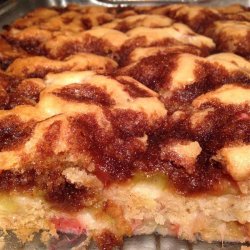 Toss rhubarb with 1 tablespoon flour, and stir into batter. Spoon batter into buttered 9 x 13 inch pan, and smooth the surface.