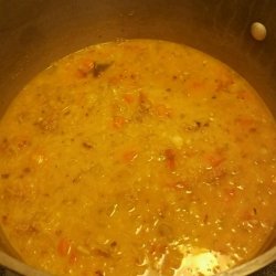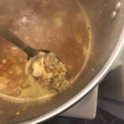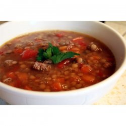 1Place sausage in a large pot. Cook over medium high heat until evenly brown. Add onion, celery and chopped garlic, and saute until tender and translucent. Stir in lentils, carrot, water, chicken broth and tomatoes. Season with garlic powder, parsley, bay leaves, oregano, thyme, basil, salt and pepper. Bring to a boil, then reduce heat. Cover, and simmer for 2 1/2 to 3 hours, or until lentils are tender.