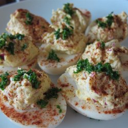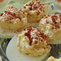 3Place egg whites cut-side-up on a serving platter. Spoon yolk mixture into egg white halves; sprinkle with chili powder.