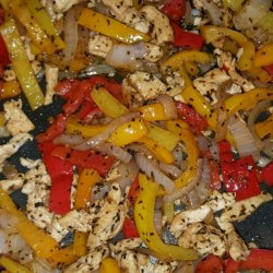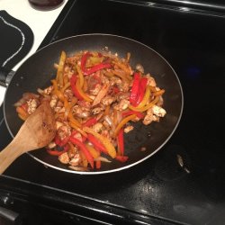 2Heat remaining oil in the skillet over medium heat, and stir in the red bell pepper, yellow bell pepper, orange bell pepper, and onion. Cook about 5 minutes, until tender. Mix in the garlic, and cook and stir about 1 minute. Mix in the basil and 2 tablespoons balsamic vinegar.