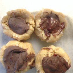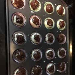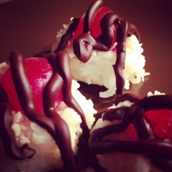 2Make indent in center of each and place on cookie sheet. Place half a maraschino cherry in indent. Fill with melted chocolate. Chill until firm. Store in refrigerator.