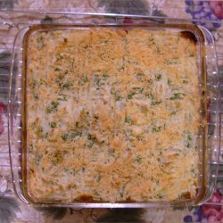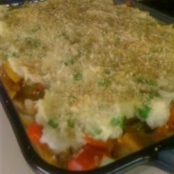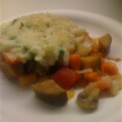 3In a saucepan, boil potatoes until done. Drain and smash. Stir in half and half, peas, salt and pepper. Spread over vegetables and top with Parmesan.