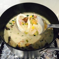 2Mix the shrimp, scallops, crabmeat, calamari, and clams, and continue cooking 10 minutes, or until seafood is opaque.